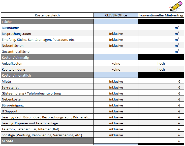 Tragen Sie einfach zum Vergleich die Kosten für einen konventionellen Mietvertrag und eigene Infrastruktur ein!