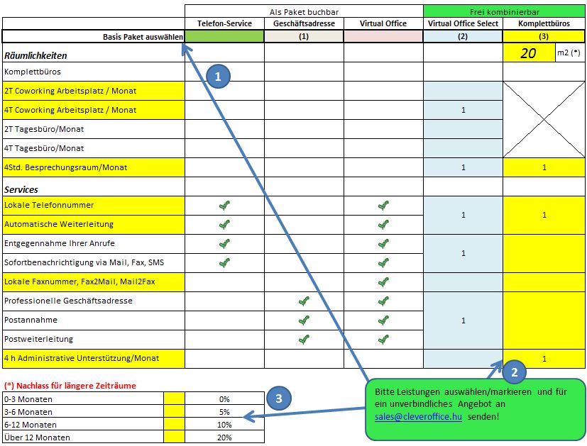 Finden Sie für sich die richtige Lösung und den richtigen Umfang die zu Ihrem Budget und Entwicklungspläne passt, und kombinieren Sie unkompliziert die intelligenten Möglichkeiten der CLEVER- Office Dienstleistungen!